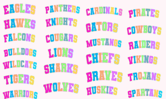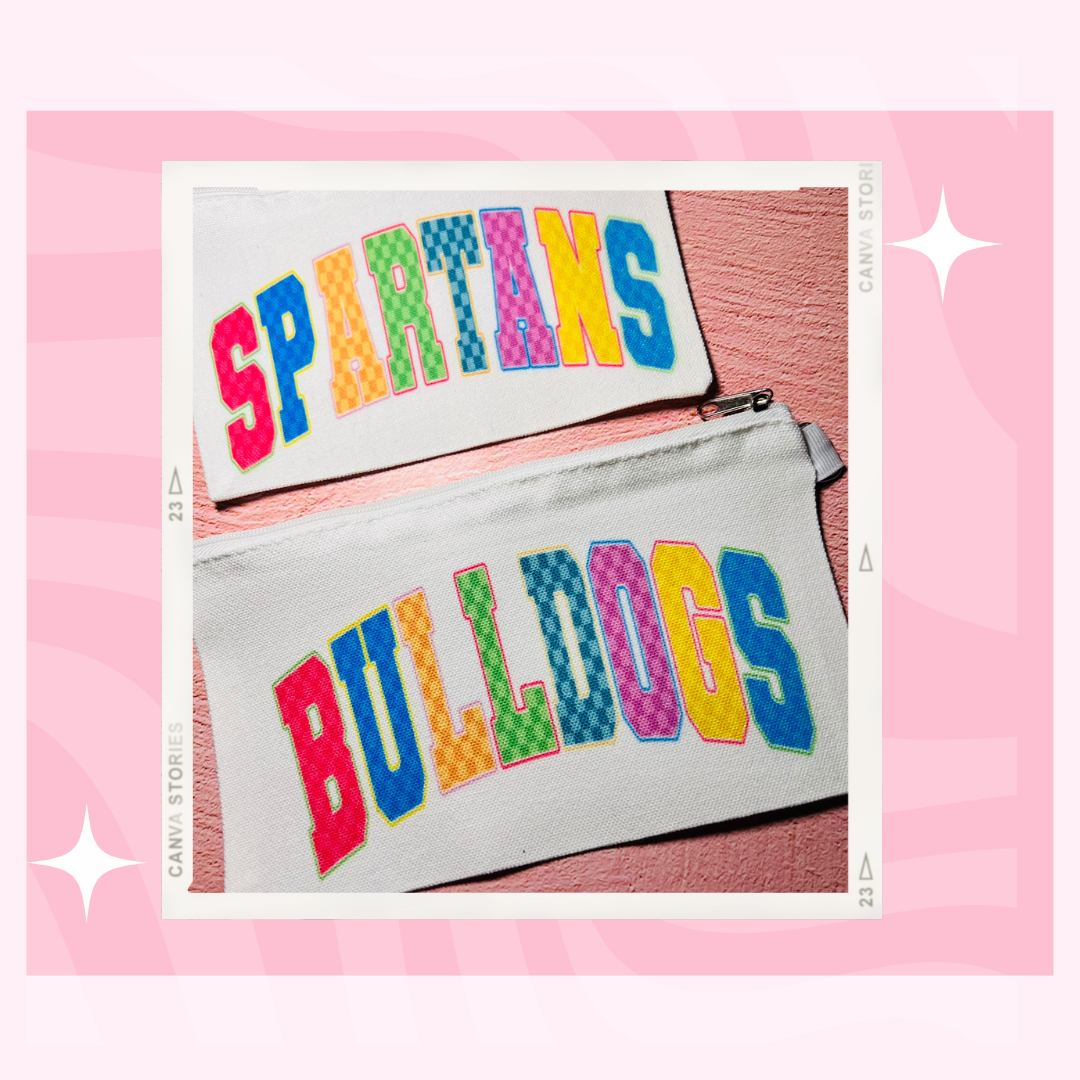 Neon Varsity Style Mascot Name, Sublimated Canvas Pouch, Cheer, Football, Basketball